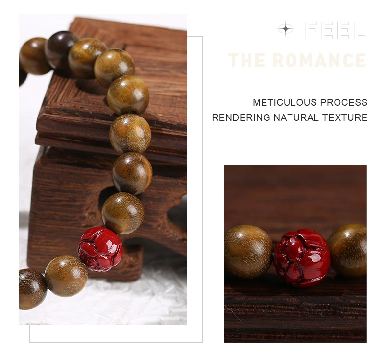 On the other hand,  cinnabar, with its unique properties and vibrant hue, is related to the element of fire. Fire represents passion, transformation, and illumination. It is the spark that ignites creativity and the power that brings about change and evolution. The carved cinnabar lotus in the bracelet introduces the fire element, creating a dynamic interaction with the green sandalwood wood. Wood fuels fire, providing the necessary sustenance for its burning and growth. In return, fire warms and activates the wood, enhancing its vitality and bringing out its latent potential. When worn, this bracelet harmonizes and activates the energies of wood and fire within the body. It can inspire the wearer’s creativity, awakening the dormant artistic talents and innovative thinking. The inner passion is kindled, giving a boost to one’s motivation and drive in various aspects of life, whether it be in career pursuits, personal relationships, or self-development. This balance and activation of the two elements also contribute to a more harmonious state of mind and spirit, helping the wearer to navigate through life’s challenges with greater ease and grace.